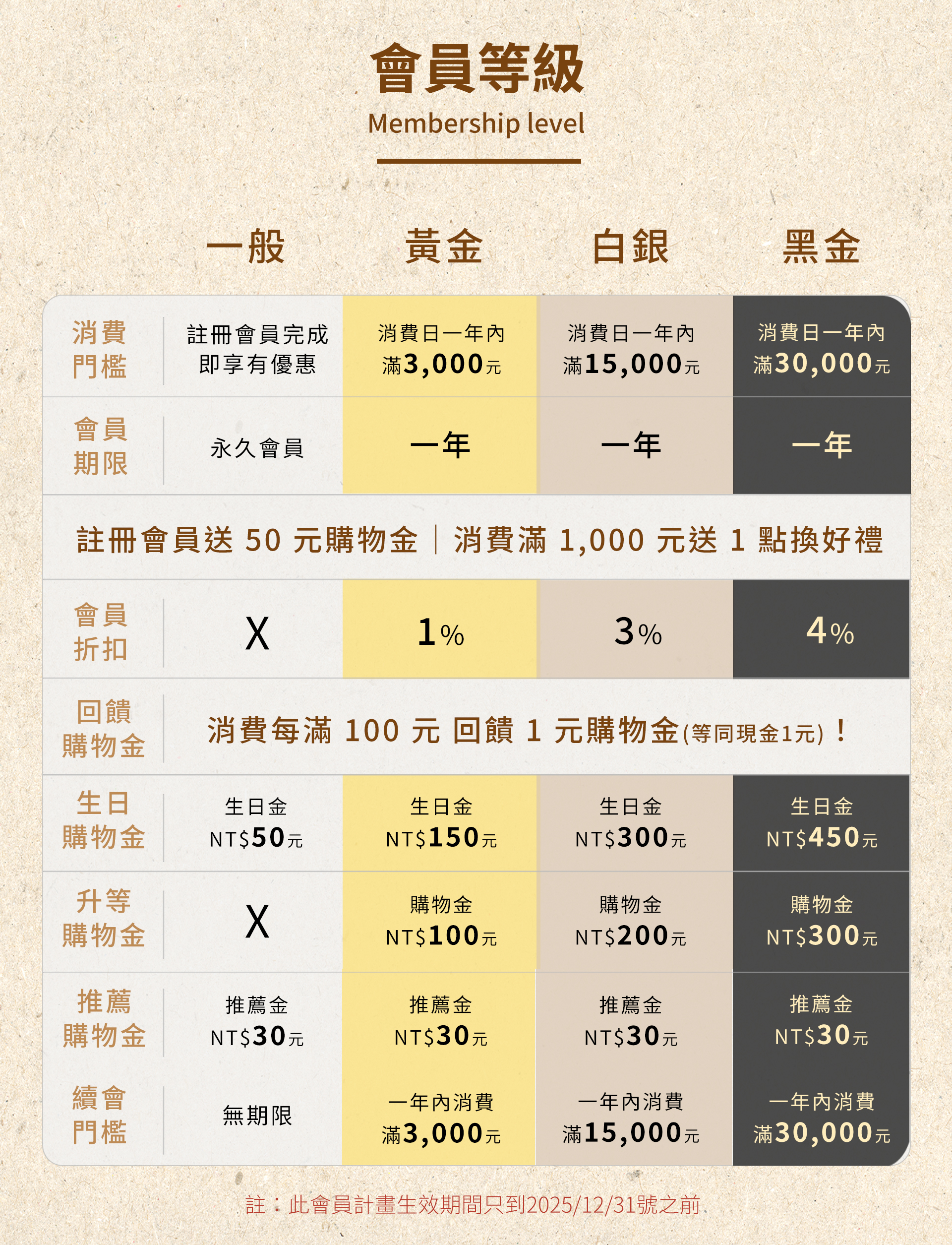 完成會員註冊後,當年消費金額累績到達會員等級門檻,隔日自動升等為該等級會員,可享有該等級會員之優惠。