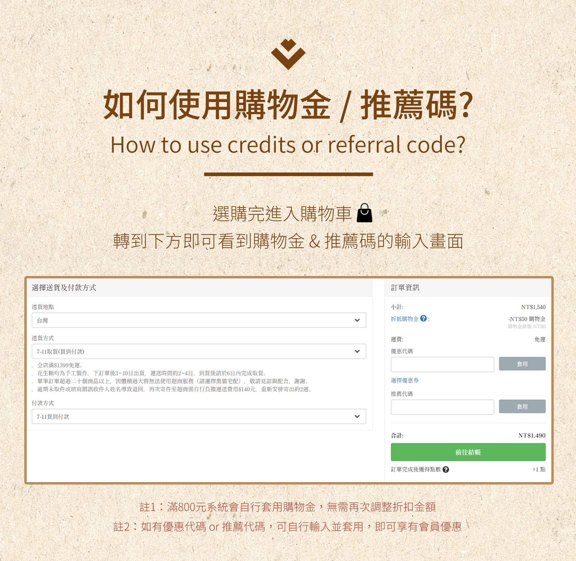 - 舊會員推薦回饋:當新顧客註冊成功且第一筆訂單已轉為「已完成」狀態後,推薦人可獲得$30購物金。