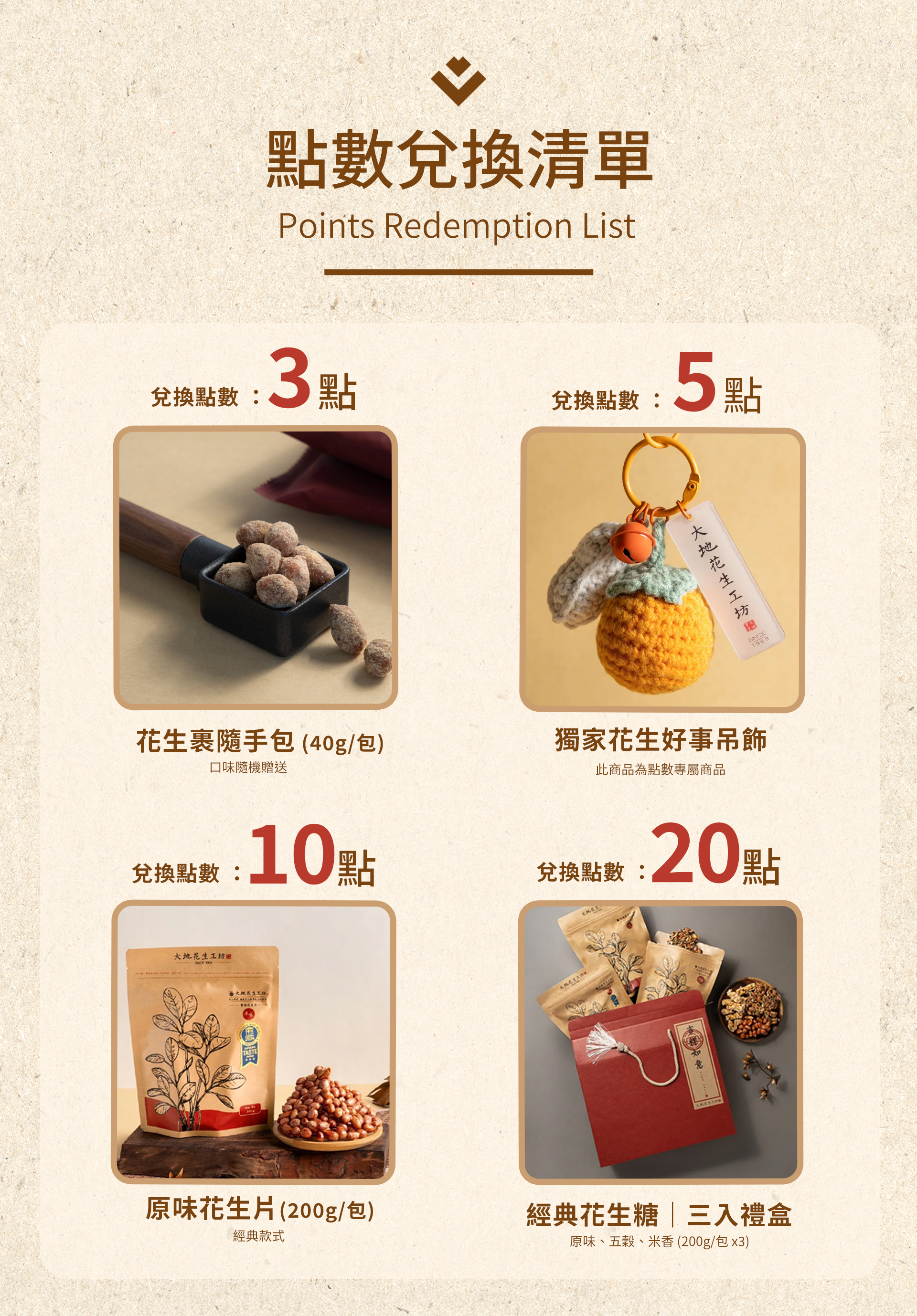 - 購物金限會員於大地花生官網使用,無法轉讓、折現、找零或於實體門市使用。