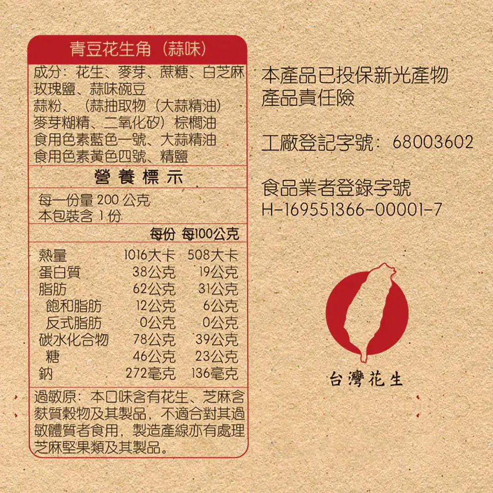 嚴選蒜味青豆仁與香炒花生片,依黃金比例融合,再佐以薄薄麥芽糖衣輕裹,每一口都是酥脆中帶鹹香的驚喜;點綴白芝麻增添層次香氣,入口酥脆、唇齒留香,是鹹甜交織的經典台味。