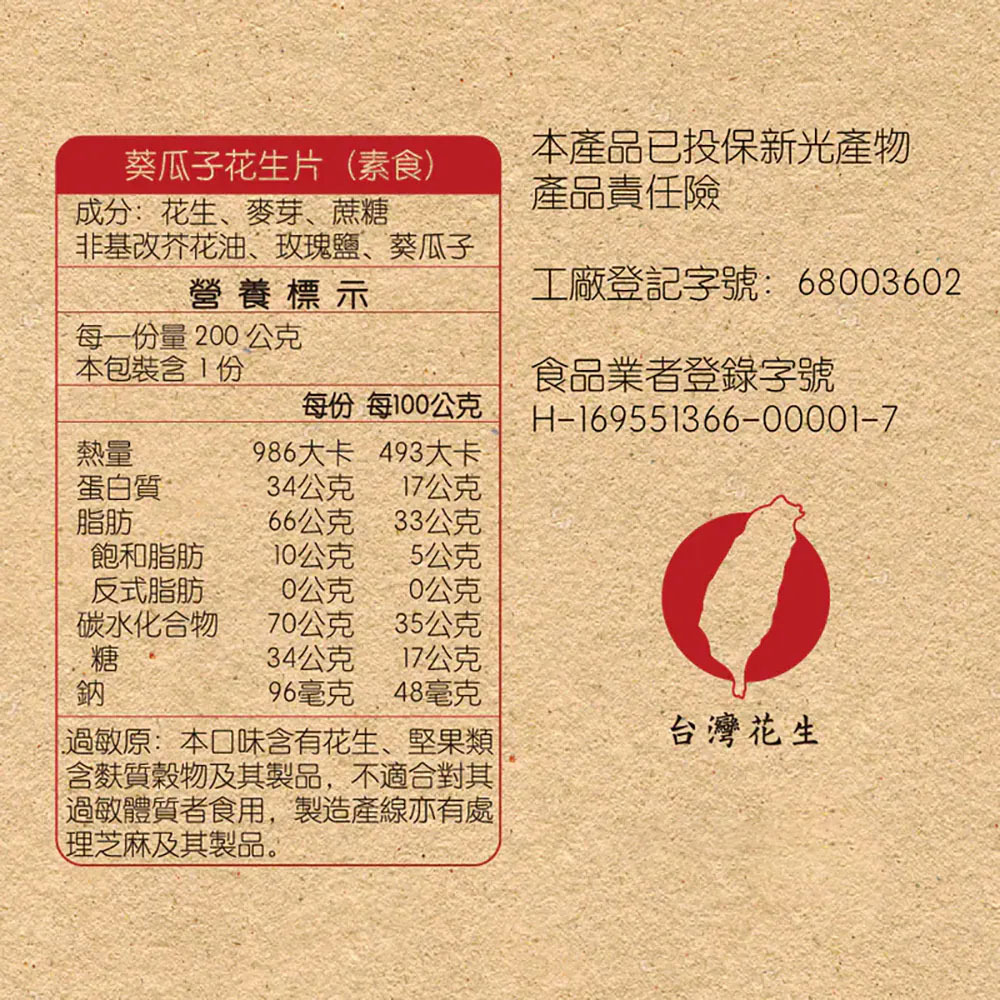 -成分:花生、麥芽、蔗糖、非基改芥花油、玫瑰鹽、葵瓜子