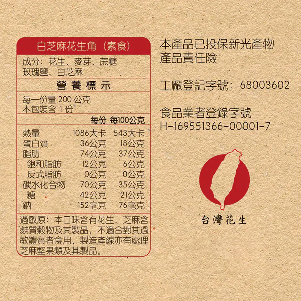 「白芝麻花生角|經典袋裝200g|溫醇芝麻香融合花生糖脆感」,以溫火手工翻炒出芝麻與花生的香韻層次,並融合祖傳黃金糖漿配方,延續職人精神,也傳遞台灣在地食材的美好。