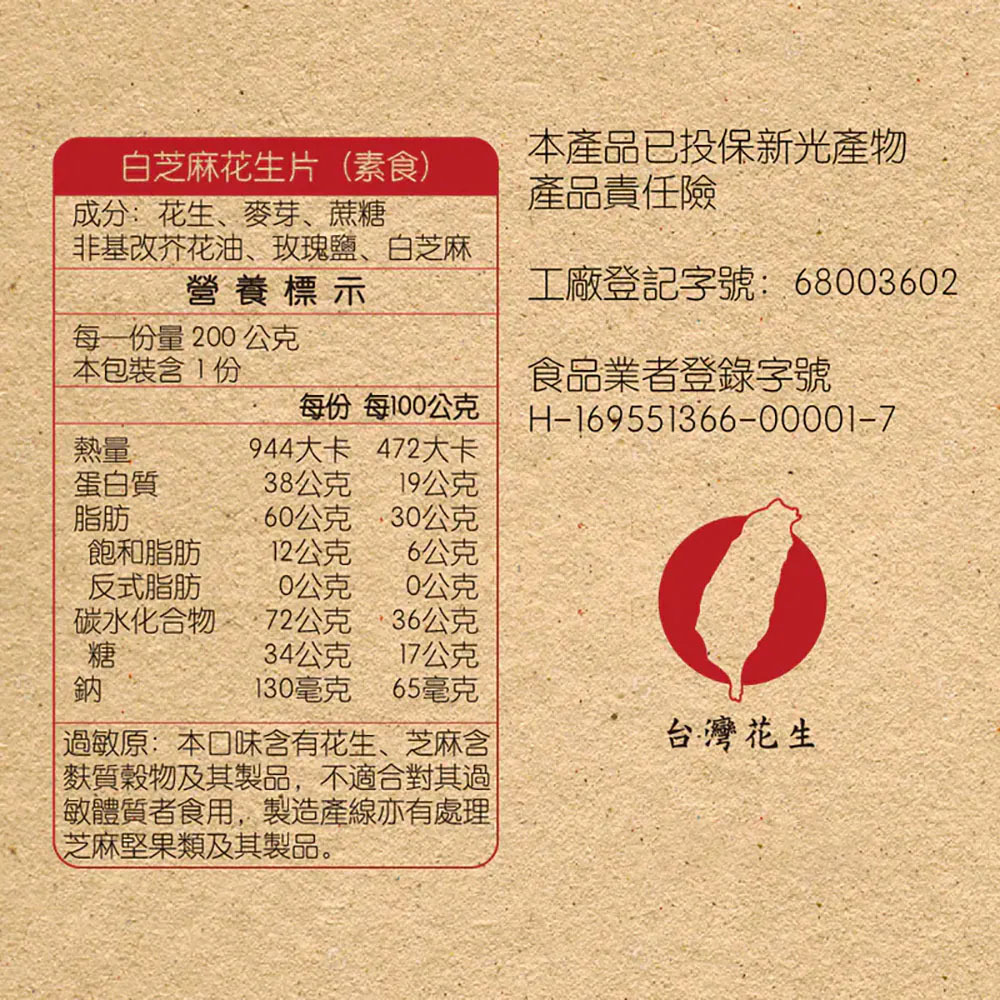 -成分:花生、麥芽、蔗糖、非基改芥花油、玫瑰鹽、白芝麻